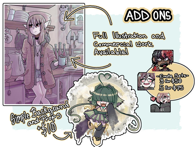 Add-ons: ( This could be props, additional characters, a background, or commercial rights. If you would like my base commission, please leave this blank.)